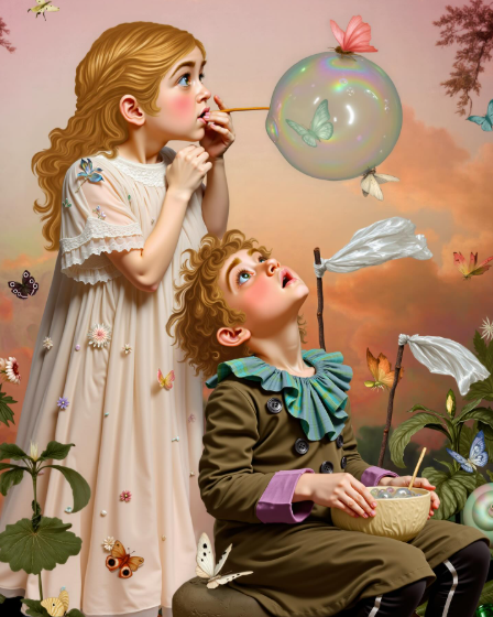 The works depict scenes featuring children and remnants of celebration, composed through references to classic motifs of the Baroque. These elements reappear here within a contemporary context saturated with images, stimuli, and discourse.