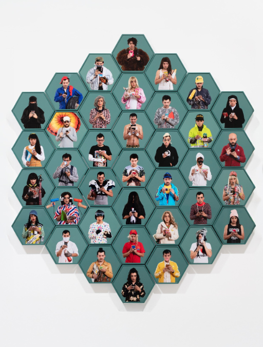 The extensive portrait series from 2017 shows a set of vividly dressed protagonists and identities, all performed by Echeverri himself, absorbed in the glow of their smartphones. The formal particularity of this group of works lies in its specific framing. Echeverri has created a honeycomb-like structure for it – each 'cell' remains concentrated on itself, has its own dynamics and tension. At the same time, their arrangement on the wall already hints at a fundamental component of content: even in isolation, every figure forms part of a larger constellation, a community. With its precise formal language, the work reflects on how contemporary visibility is shaped by self-observation, digital habits and the tension between individuality and belonging.