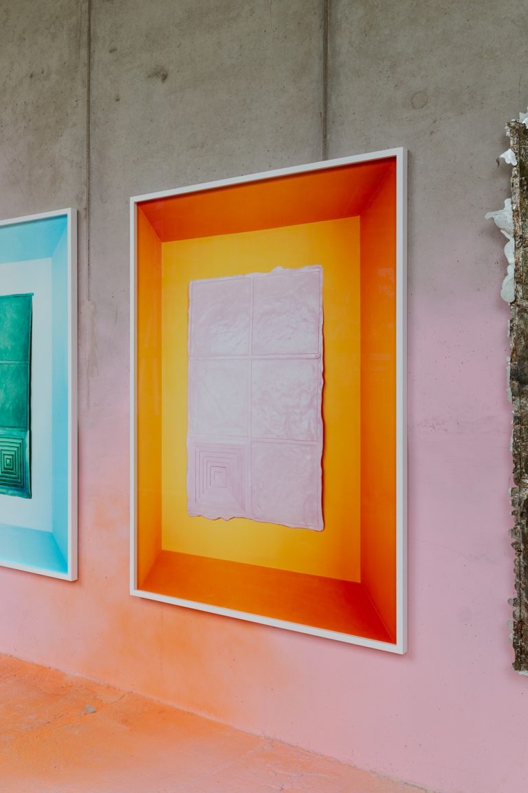 A large photographic piece, subtly hand-altered, invites viewers to reconsider this often-ignored structure. Alongside it, the artist presents photographic-sculptural hybrids in plexiglass boxes. Varying in size, some lie flat against the wall, while others extend outwards, exposing both sides like futuristic display objects—present-day relics seen through a future lens.
