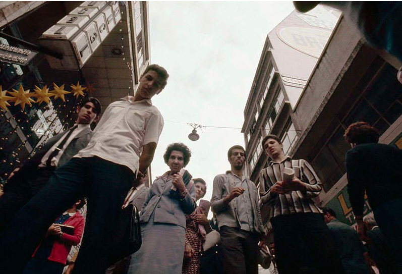 The photos in the Rua Direita series were taken around 1970 in one of the busiest areas of downtown São Paulo. Lying on the ground, Andujar created an angle that magnifies the pedestrians and places them against the buildings. This framing highlights the passersby and draws their gaze to the center of the image, transforming the photographer—and by extension, the viewer—into a subject of the scene. The series exemplifies the tradition of street photography established in the United States, refined by Andujar using narrative sequence and color, which was still uncommon at the time.